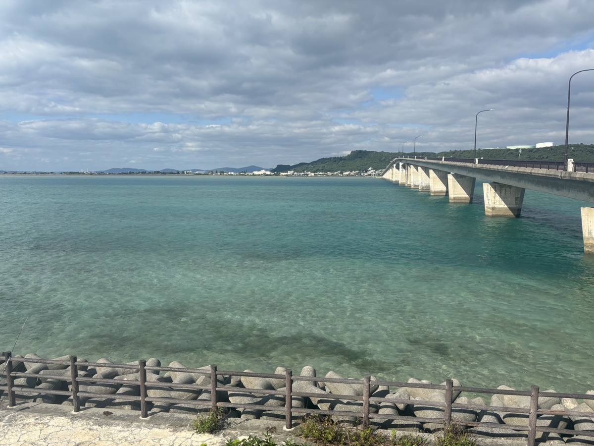 島と島にかかる橋を通るのですが、建物が一切なく地平線がくっきりをわかるぐらい見渡せる絶景で一番沖縄を感じられた場所だと思います。